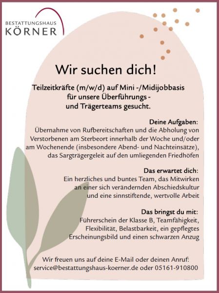 Unser Team ist für Sie da, egal wann und wo Sie uns brauchen. Ob in unseren Räumlichkeiten in Walsrode, im gesamten Heidekreis oder bei Ihnen zuhause, wir schaffen Zeit und Raum für den letzten Weg.